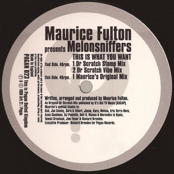 Maurice Fulton Presents Melonsniffers – This Is What You Want VG+ 12" Single 1998 Pagan UK - House