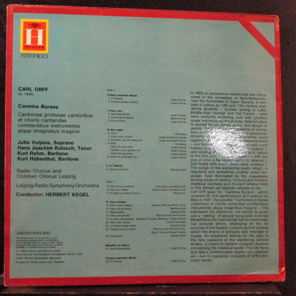 Carl Orff - Herbery Kegel, Leipzig - Carmina Burana LP Mint- 2548-194 UK Record