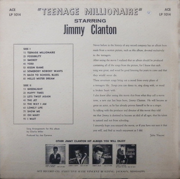 Jimmy Clanton - Teenage Millionaire - VG LP Record 1961 ACE USA Original Mono Vinyl - Soundtrack / Pop Rock /