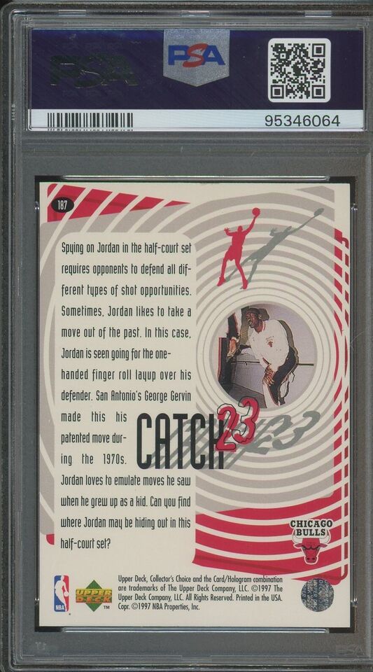 Michael Jordan - 1997-19998 Upper Deck NBA ollector's Choice Catch 23 Finger Roll Card #187 Chicago Bulls - PSA 7 NM