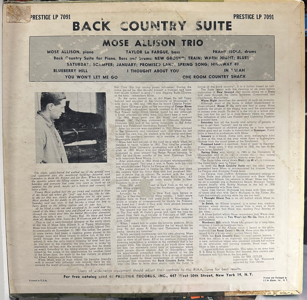 Mose Allison - Back Country Suite For Piano, Bass And Drums - Mint- LP Record 1957 Prestige USA Mono Original Vinyl - Jazz